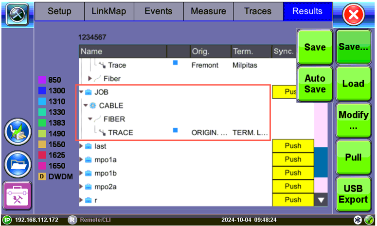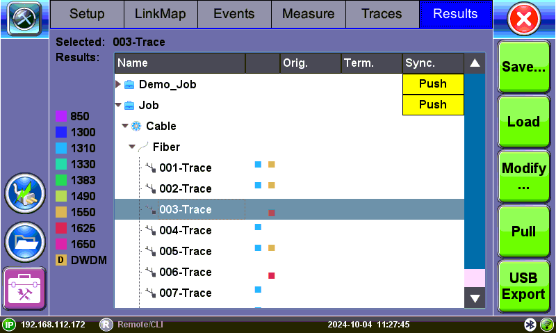 The Results tab is used to view previously saved OTDR test results. OTDR traces can also be manually saved using the Results tab.