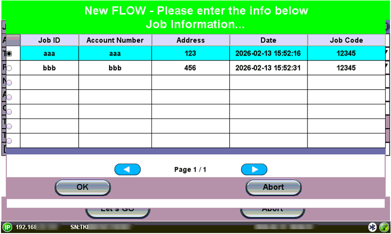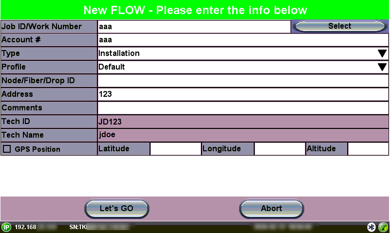 The job information, such as the Job ID, Account number, Address, etc. will be populated automatically. Select Let's GO to continue the Flow® test. Refer to Flow® Tests.