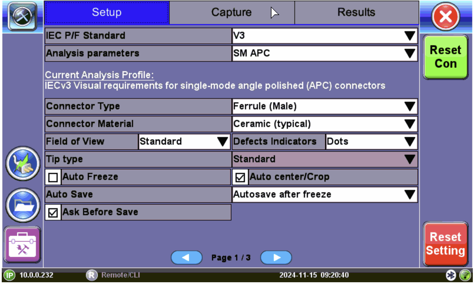 It presents a real-time view of the connector’s end face allowing for alignment and focus. The capture screen displays a live image of the connector face and features analysis and freeze tools.