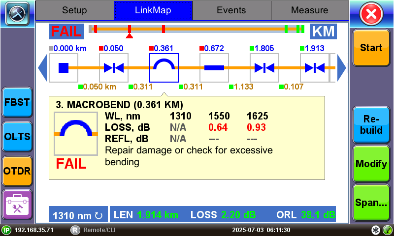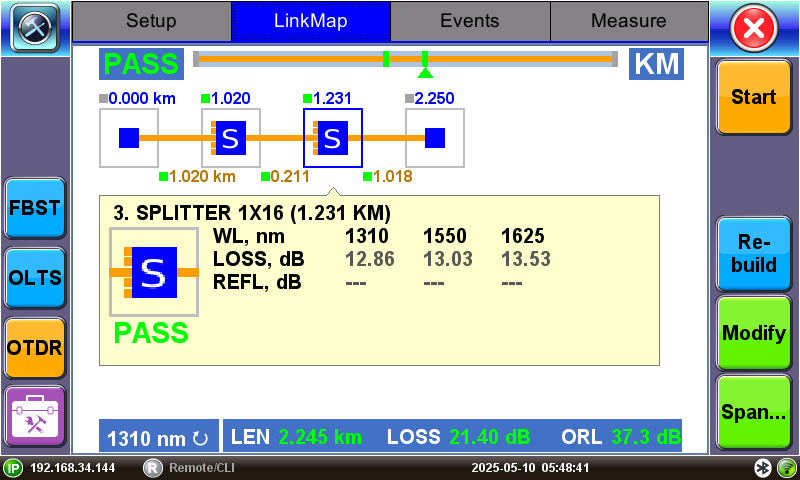 The LinkMap view presents a simplified view of measurement results by analyzing all the event table results for each pulse, whether using single or multiple pulse widths, and all test wavelengths. A span summary is displayed, in the form of a block diagram, for each test wavelength shown at the bottom of viewing window.