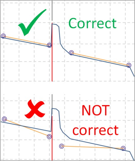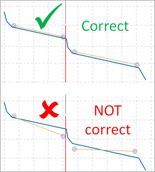 To manually apply the markers, select the longest straight sections and approximate the fiber under test as closely as possible. Avoid sections where the trace is rounded. Keep the lines strictly on the backscatter, even if it is noisy. The central marker must be placed at the very beginning of the event (see the example below).