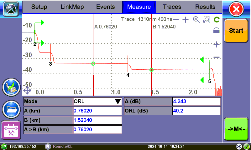 - Place marker A at the beginning of the fiber under test and marker B at the end of the fiber span under measurement (just before end reflection, if available). Moving marker B beyond the end will not change the span ORL; moving marker B to less than the end will result in a change in ORL.