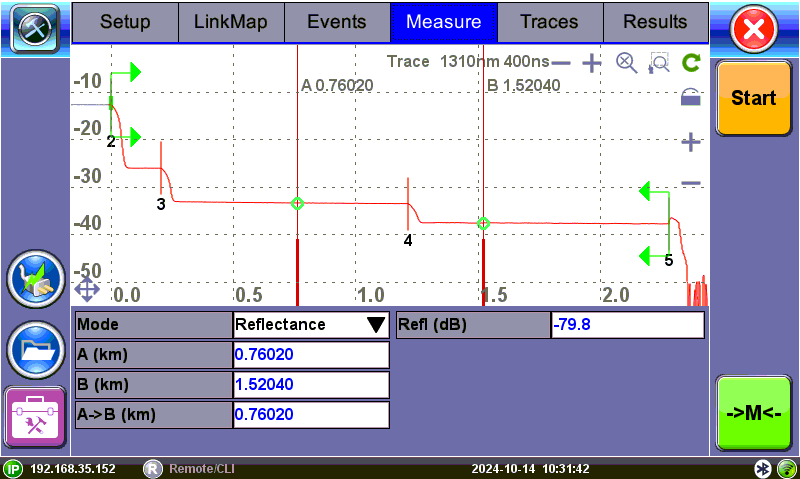 At the top of the screen next to the markers, the position of the marker with respect to the beginning of the optical fiber is indicated in kilometers, miles or feet.