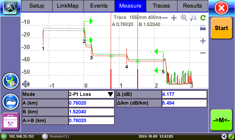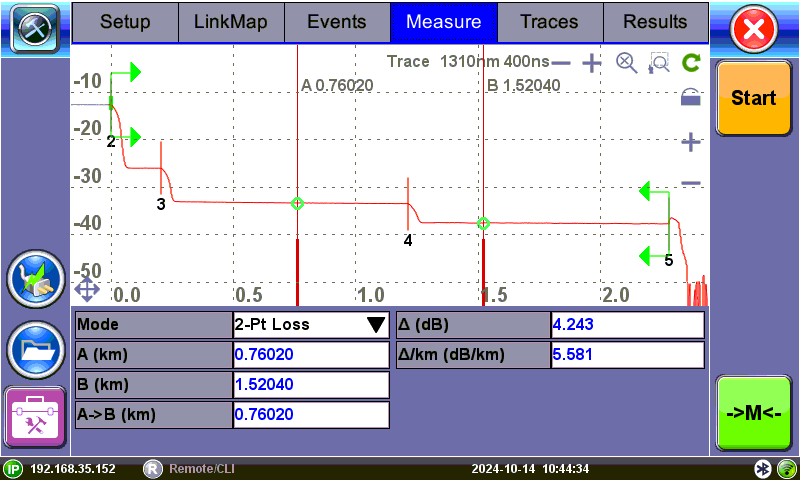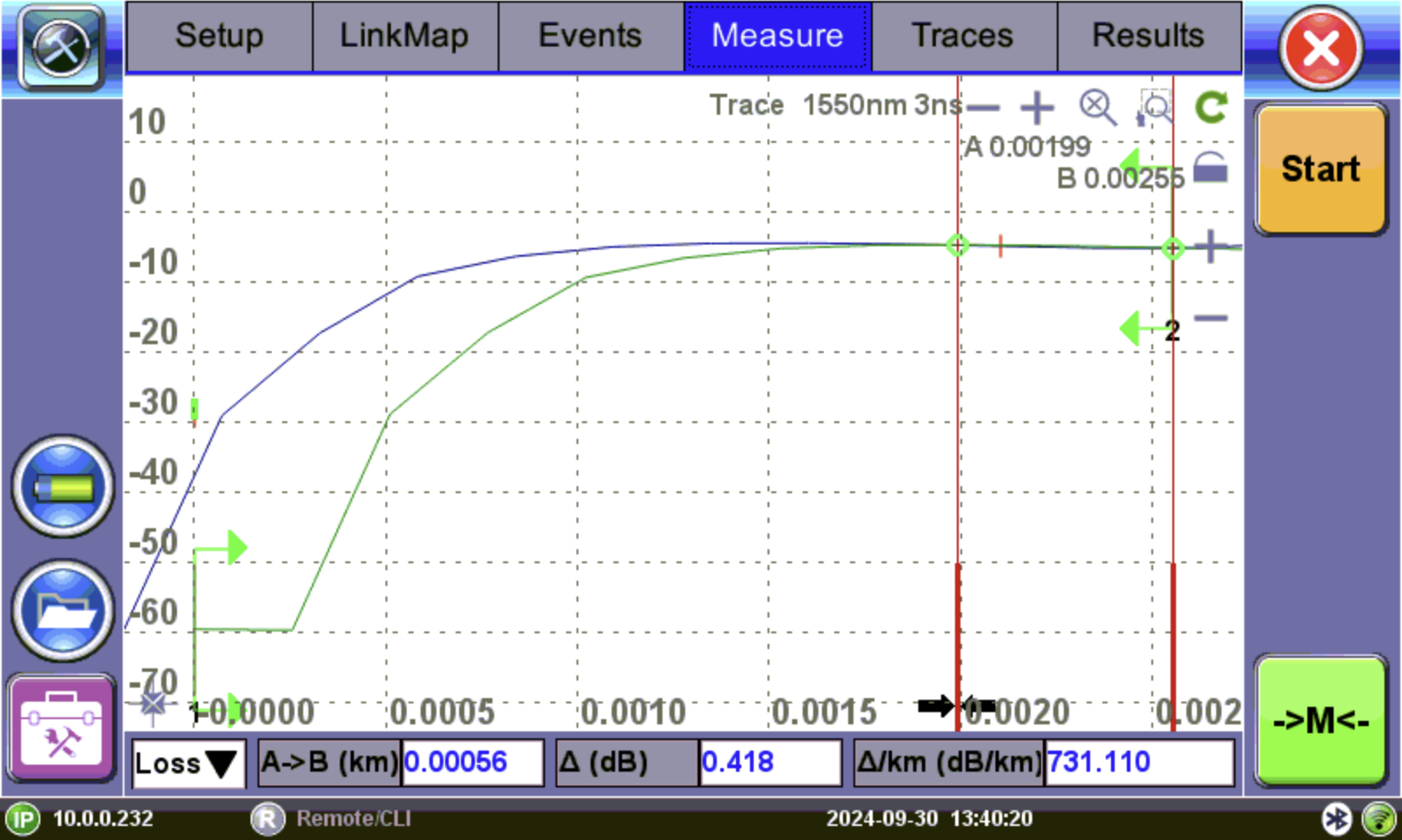 The 2-Point Loss mode is the default view. It uses a data point at Marker A and Marker B to calculate the dB level difference between the two points. Usually the backscatter level value of Marker A is greater than the level of Marker B and a positive loss measurement is displayed. If the loss value is reported as a negative quantity, it is termed a "gainer".