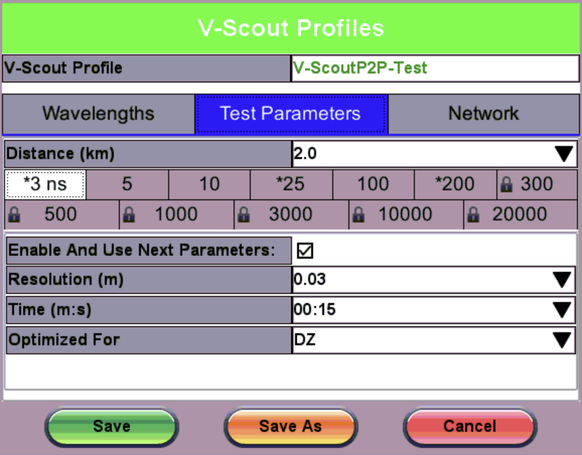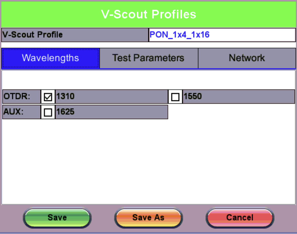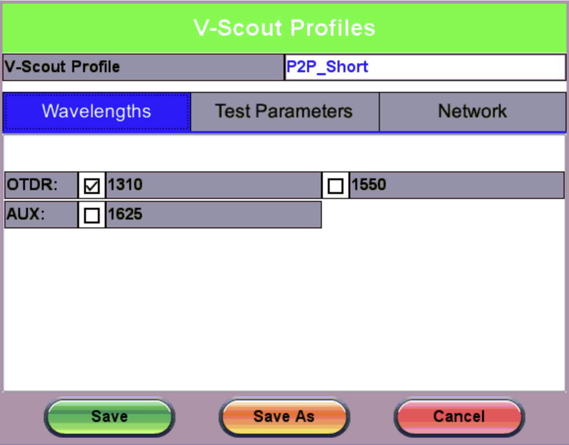 Selecting the V-Scout profile will apply the test plan using that profile for every fiber test automatically. When the V-Scout Mode is selected as a Test Parameter, wavelength options are greyed out. Specify wavelengths on the V-Scout Profiles screen (shown below). The wavelengths you assign to the profile are selected for the Test Parameters for the V-Scout Profile automatically; however, Pulse Widths (PW) must be selected AND enabled on the profile screen.