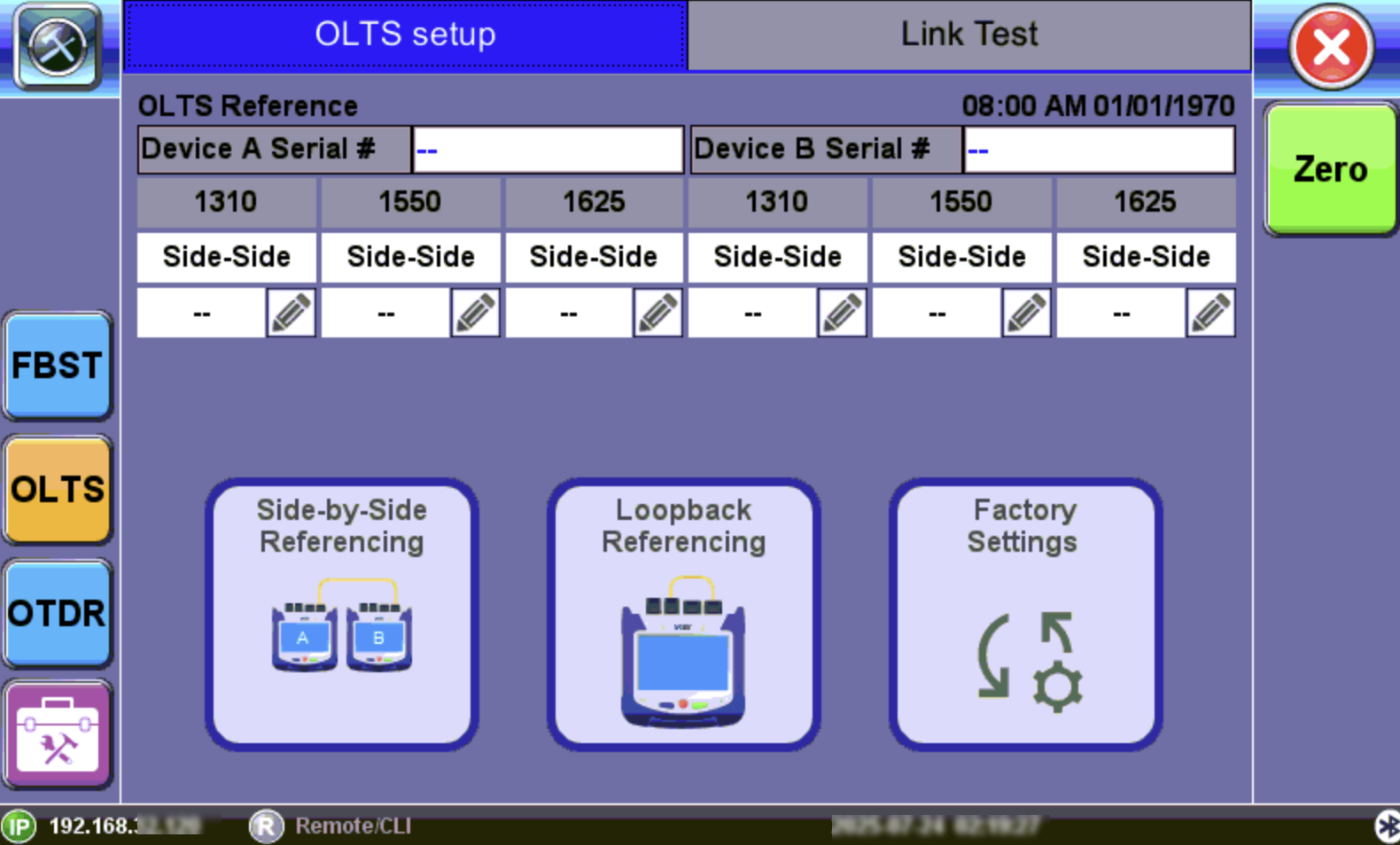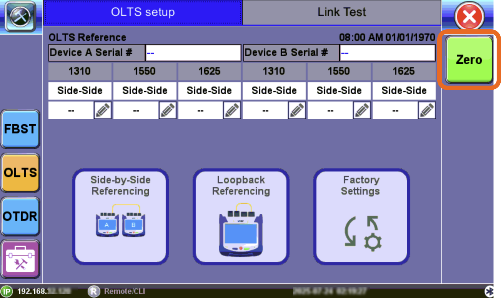 Use by connecting two units next to each other.Connect the OTDR ports on both test sets together, using a clean patch cord that will be used for testing. If needed, on the Remote test set, select the FBST button to place in FiberBEAST™ mode. Keep the main Controller test set in OLTS mode and select Side-by-Side Referencing. The test sets will perform insertion loss and ORL referencing automatically and store these references in the main unit for future tests. The remote unit does not require any user input or action.