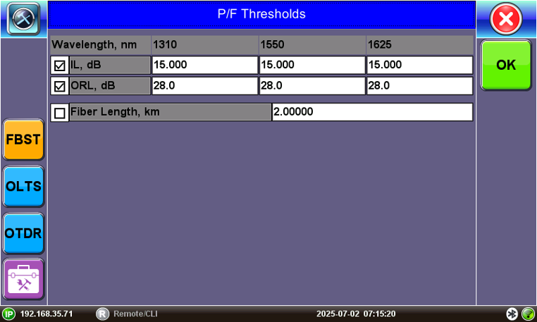 Select P/F to set threshold values for acceptable loss that match test requirements in the OLTS setup. For each wavelength, enter the maximum loss and the minimum ORL in order to pass, as well as the fiber length that you expect to see. Refer to Thresholds for information on OTDR thresholds for splice loss, connector loss, attenuation, etc.
