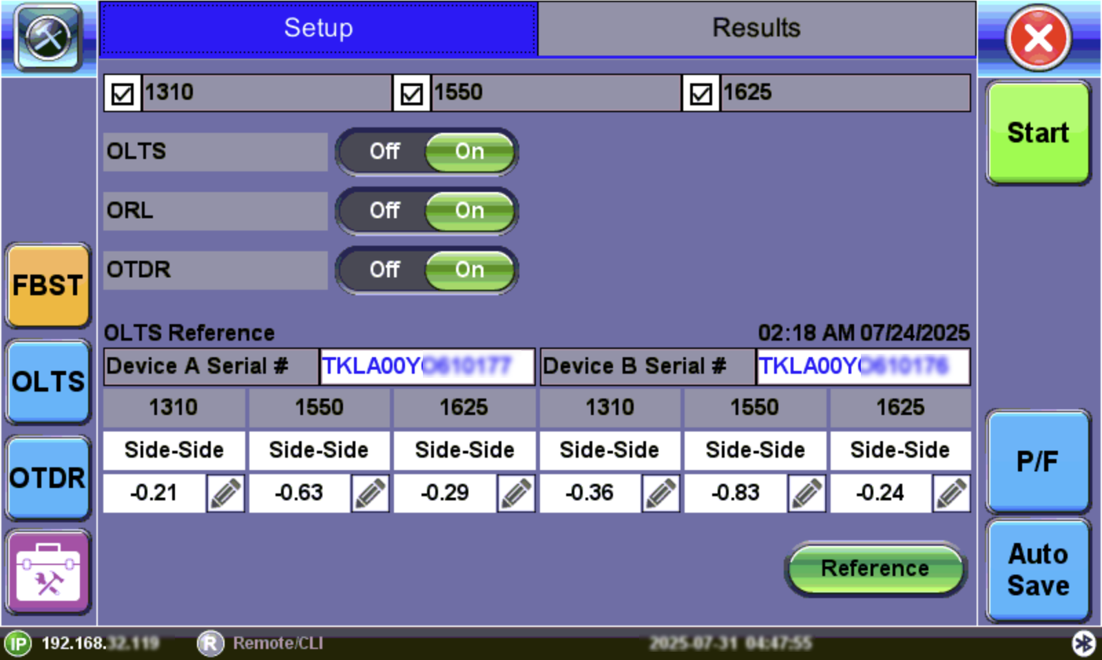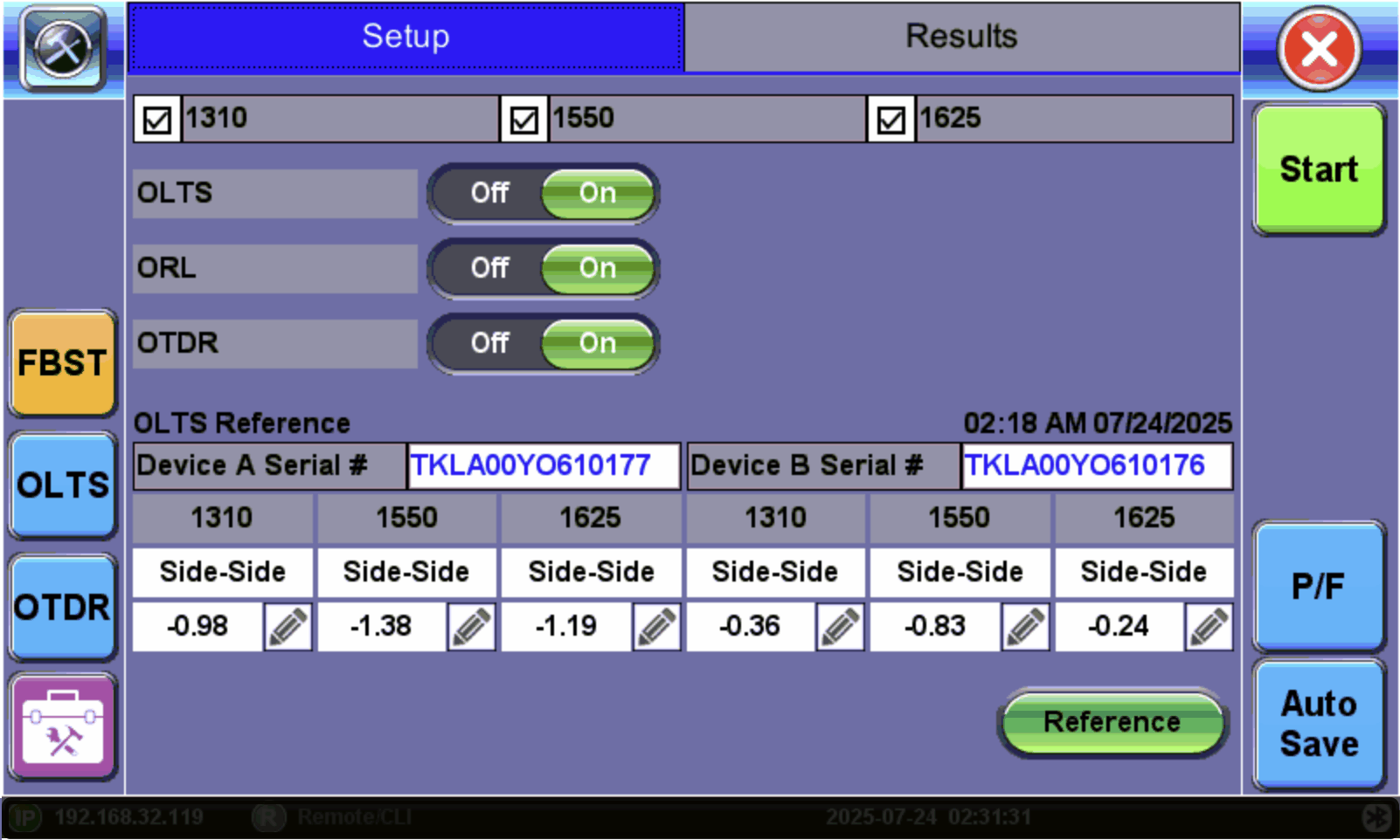 If including OTDR in the testing, select OTDR and configure settings. Refer to Setup Screen. Select the FBST button to return to the Setup screen.