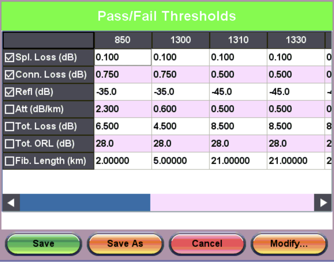Each column heading displays the wavelength to which the Pass/Fail Thresholds apply.