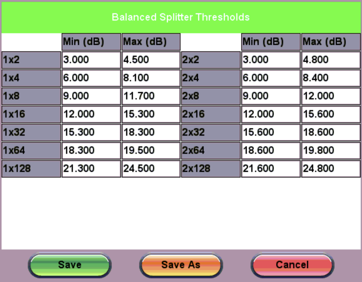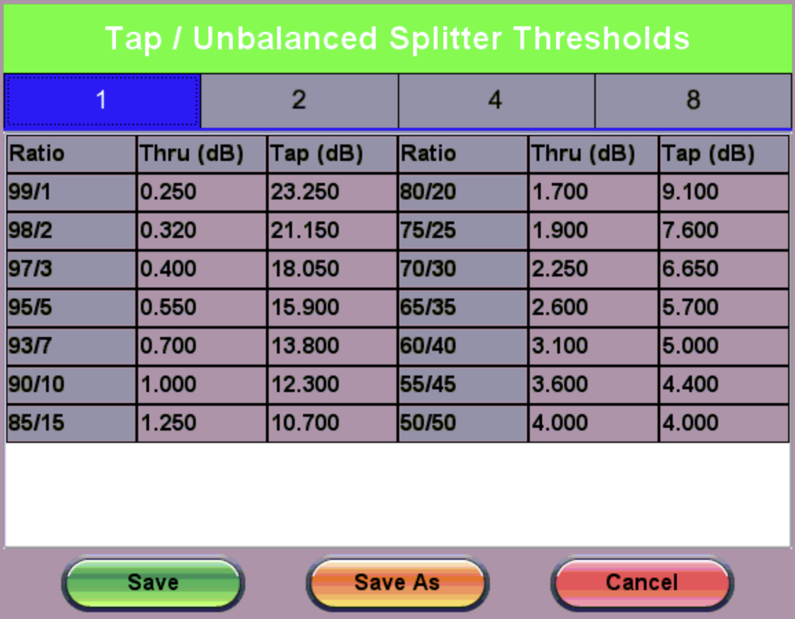 to the left of the T. Thresholds field to access the Tap Splitter Thresholds screen and enter custom threshold loss values. The Term Tap field appears to balance remainder.