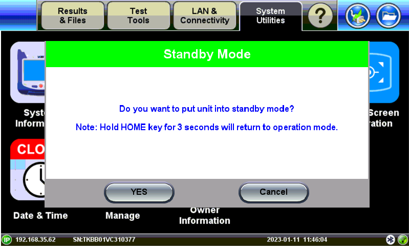 Standby Mode puts the unit to sleep, so that it wakes up faster than pressing Power to turn on the unit. To enter standby mode, press and hold the Home key for 3 seconds until the unit beeps, then tap YES. The screen will be off, but the power LED will blink. Press Home to view battery life and standby mode run time. Pressing and holding Home for 3 seconds again will return the unit to normal operation.