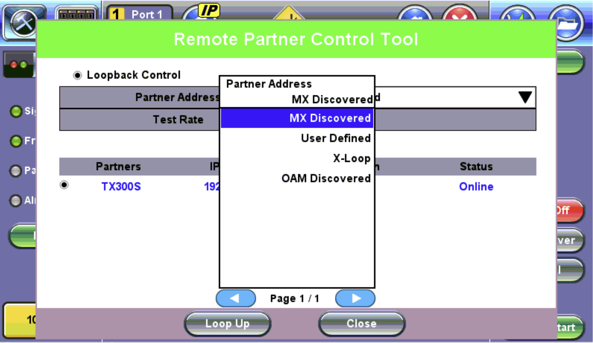The Loop Control button becomes available on the right side menu when any Ethernet application (V-SAM, RFC 2544, Throughput, BERT) is selected. Press the Loop Control button to configure loop up and loop down commands necessary to control a far-end unit. The loop up command contains information about the test layer. Looping back test traffic is possible as follows: