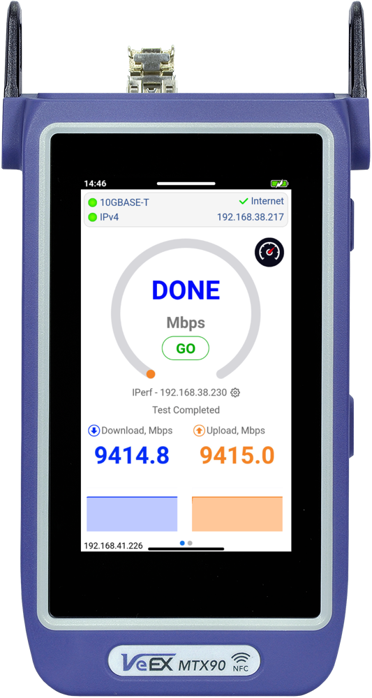 Use this guide to learn how to operate the MTX90 Multi-Gigabit Internet Service Analyzer when installing, verifying, or troubleshooting of FTTx, Mobile FrontHaul/BackHaul and Metro fiber networks to identify root cause of service issues. The MTX90 offers PON ONT emulation and Quality of Experience (QoE) validation using Speed Test and V-PERF at speeds up to 10 Gbps, as well as Wi-Fi performance verification.
