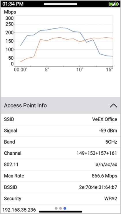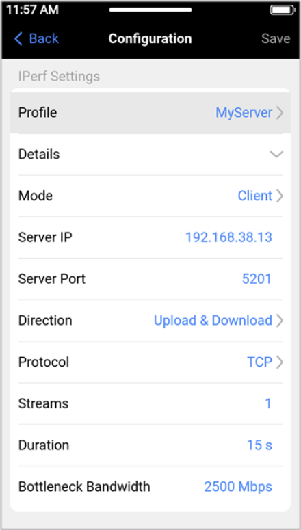 Tap the iPerf button (or the V-Pert button for wired applications) to setup the iPerf test parameters.