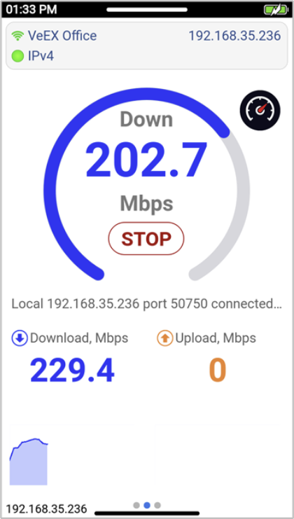 The iPerf Internet Performance test (also known as V-PERF in other VeEX products) is an advanced Layer 4+ network performance validation tool, based on the RFC6349 test methodology. It measures the maximum achievable bandwidth between two devices and provides insights into throughput, stability, and potential network issues. The tool supports both TCP (Transmission Control Protocol) and UDP (User Datagram Protocol) protocols.