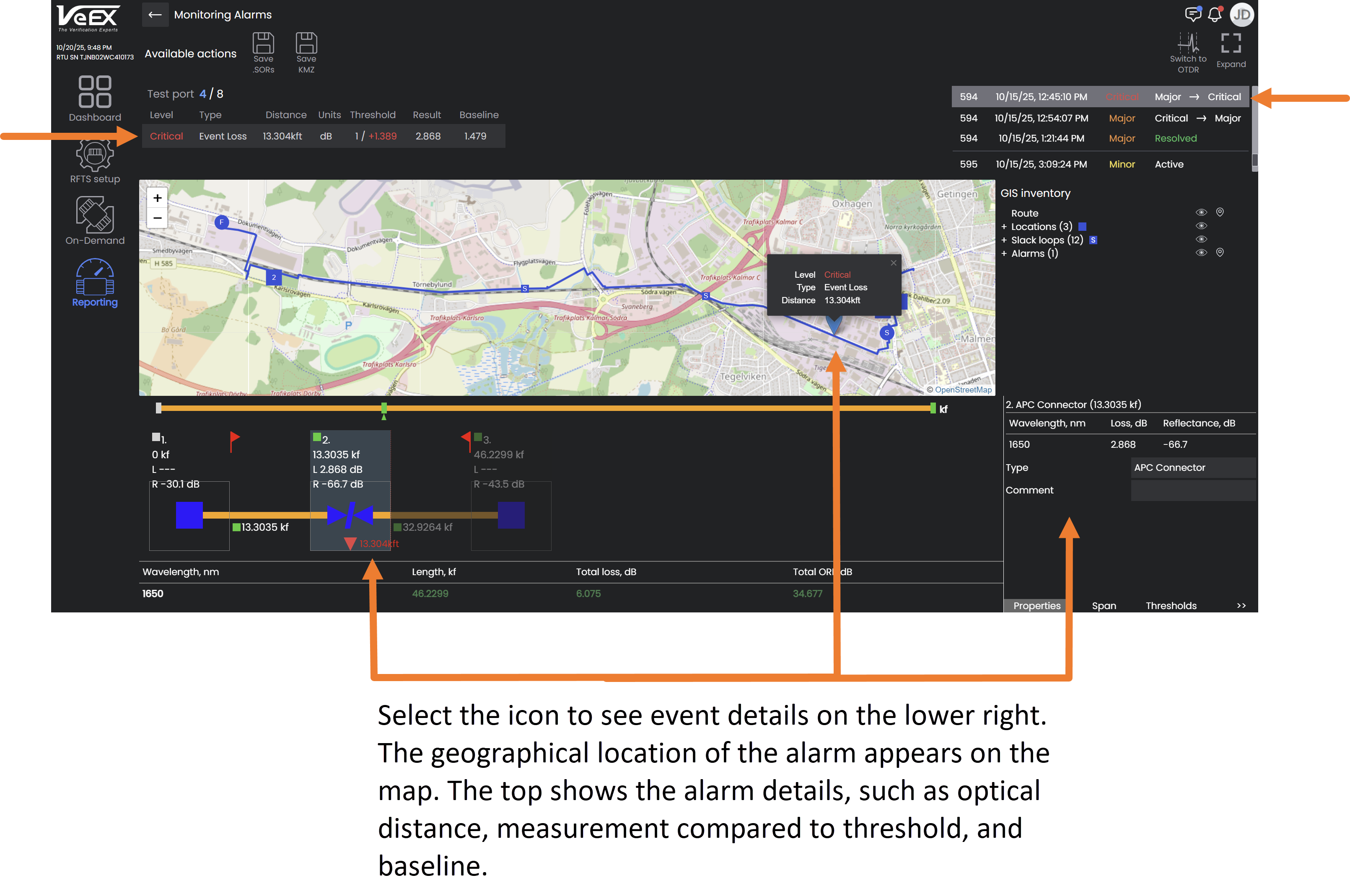 When an event icon is selected, the event details are displayed in the lower right. The geographical location of the alarm appears on the map. The top shows the alarm details, such as optical distance, measurement compared to threshold, and baseline.