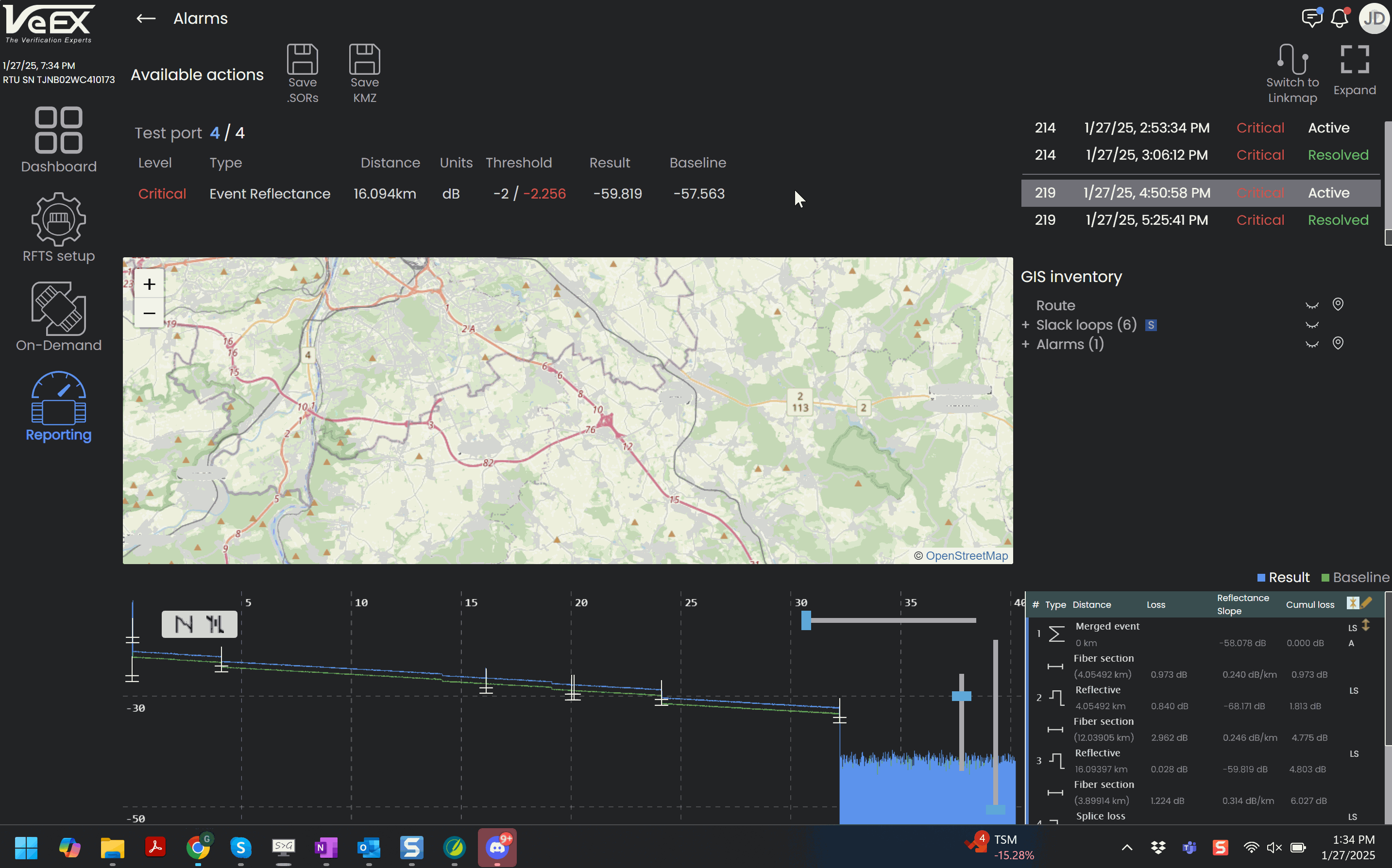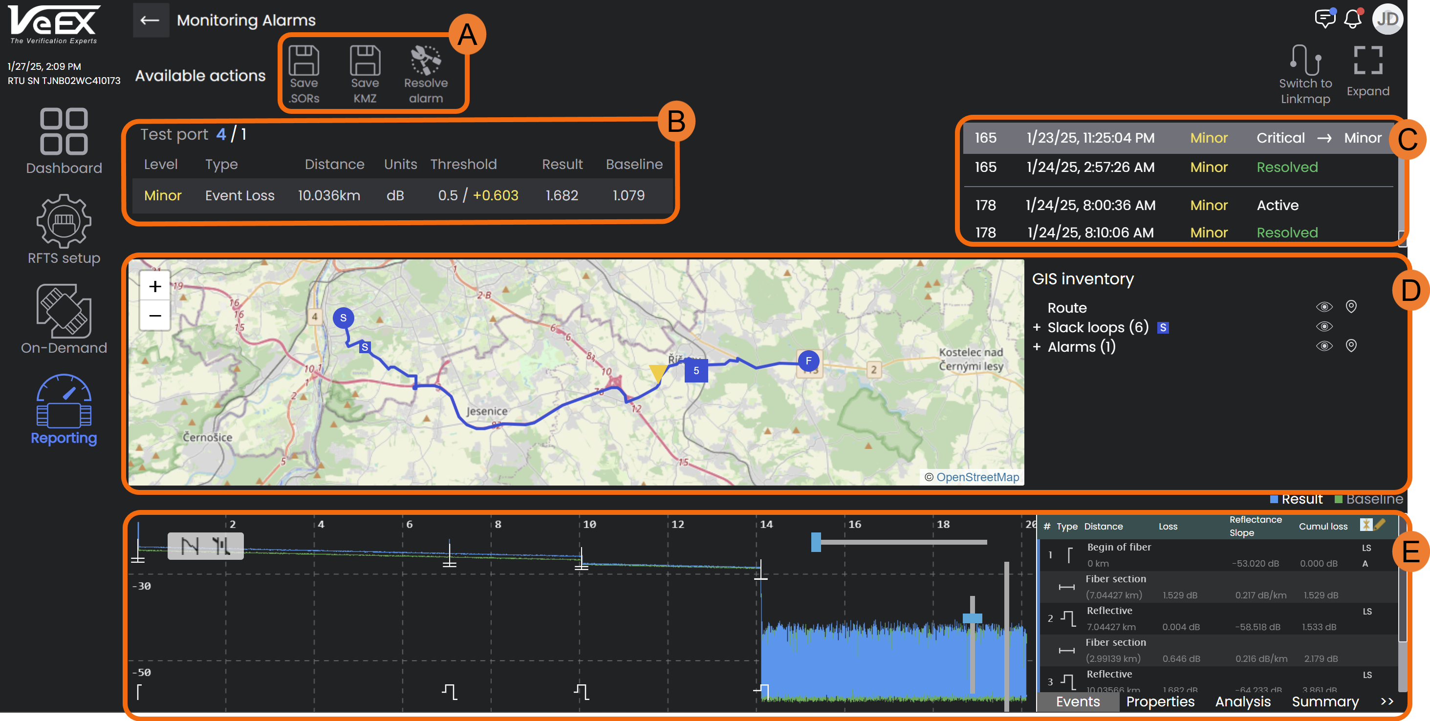 The Alarms screen shows the alarms triggered, alarm history, fiber route map, and trace.