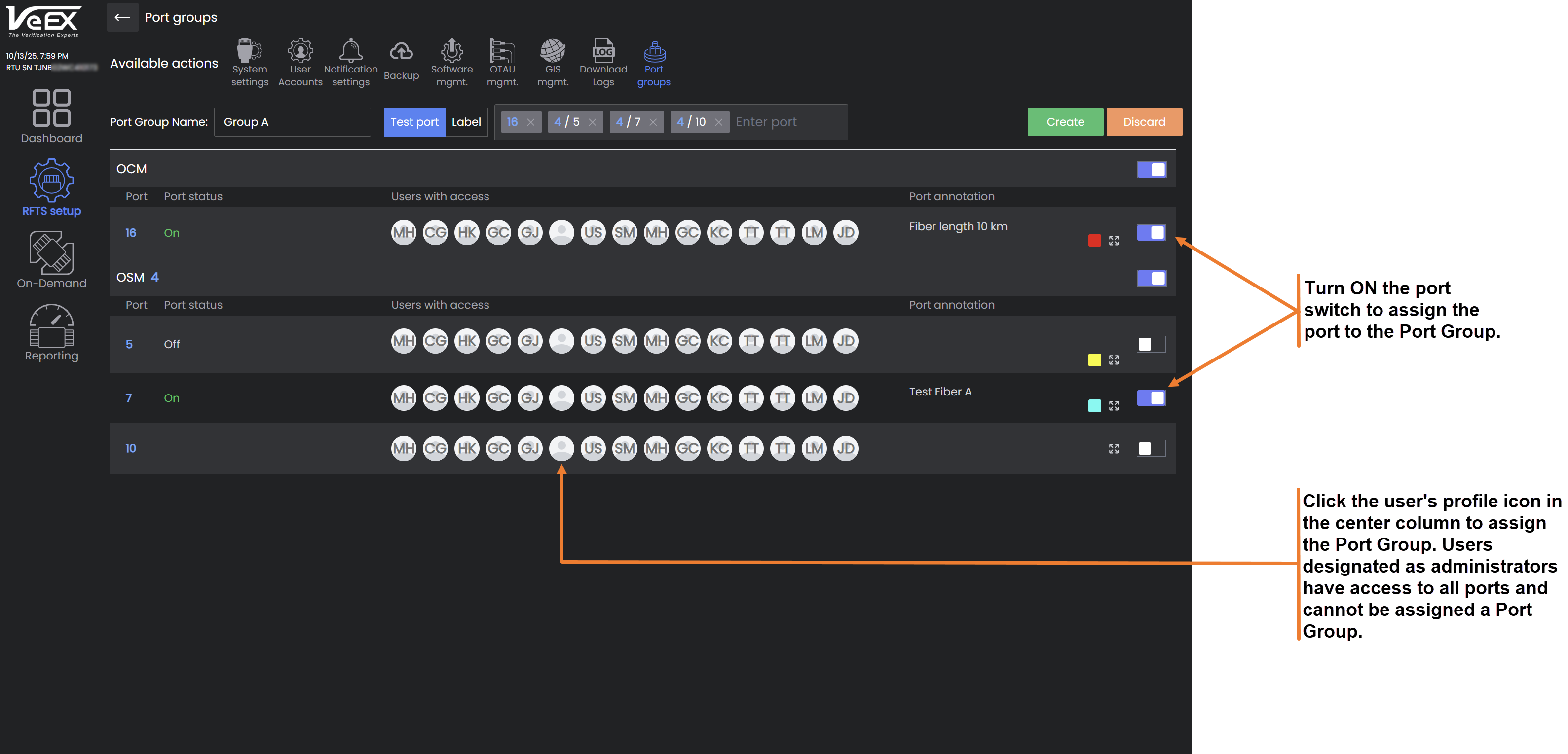 Administrators can create Port Groups to limit visibility of specific ports, so that users can view and work only with the test ports for which they are responsible. Multiple ports can be assigned to a single Port Group. The Port Group can be assigned to a user, so the user can only see those ports assigned to the Port Group. Notifications are triggered and sent only to users who can access the test ports affected by the alarm.