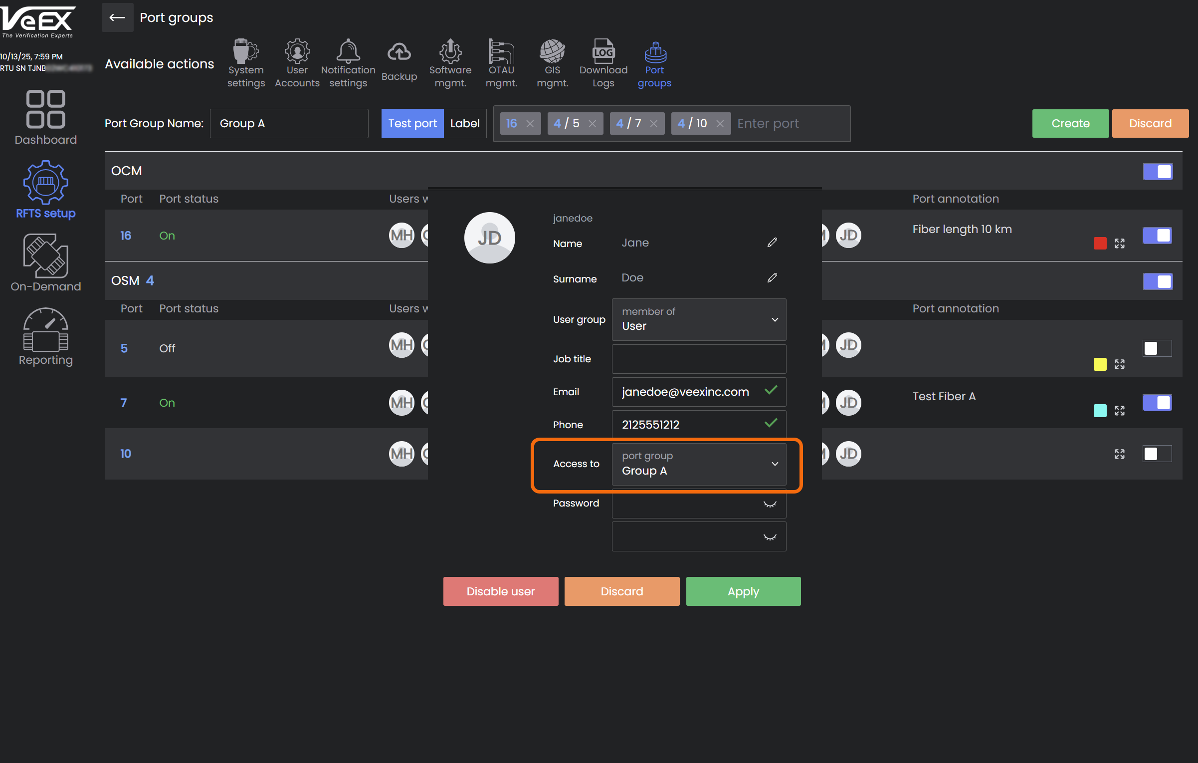 Assign the Port Group to a user so they can see only those ports associated with the Port Group by clicking the user's profile icon in the center column or from the User Accounts screen. Refer to Adding Users.