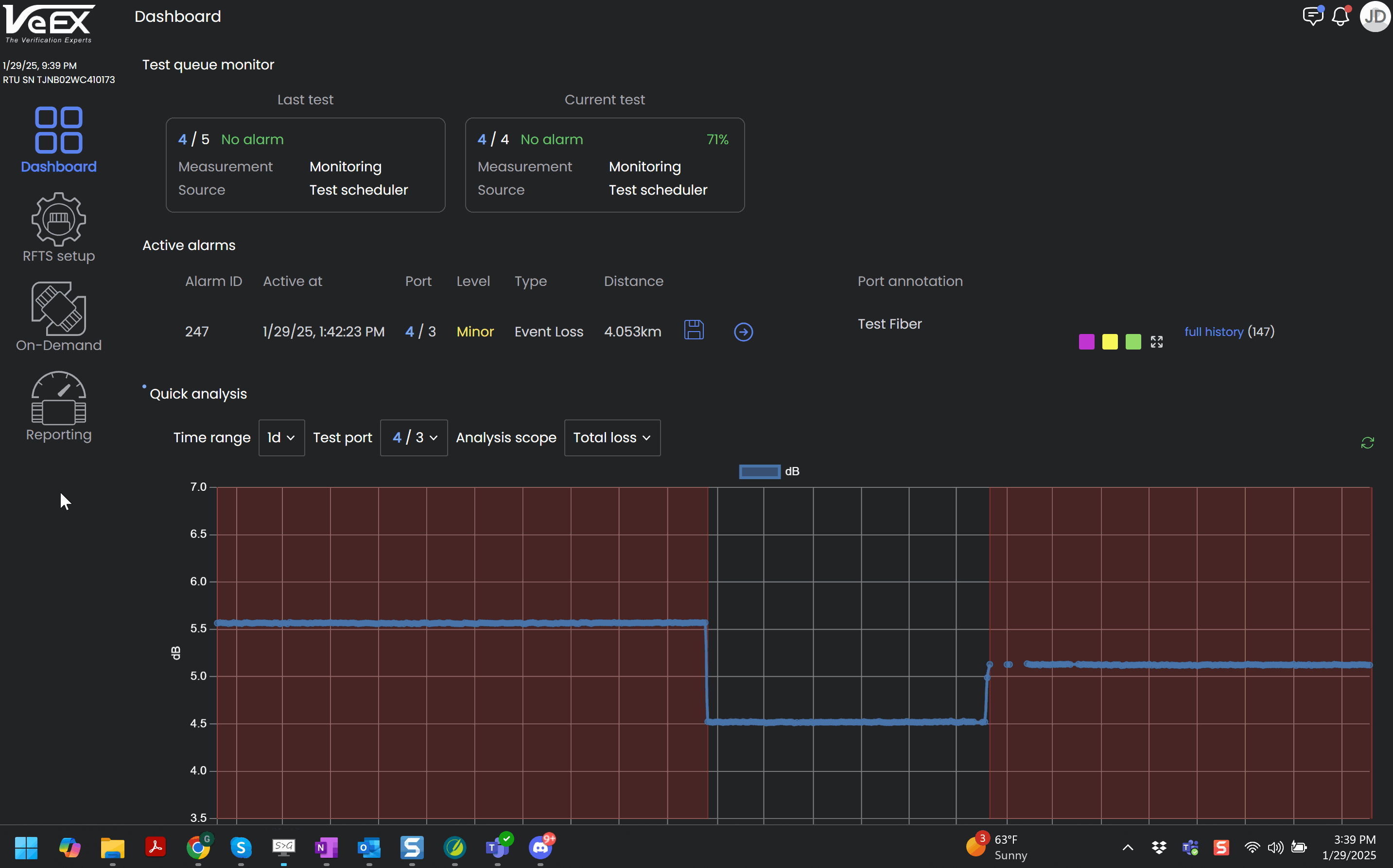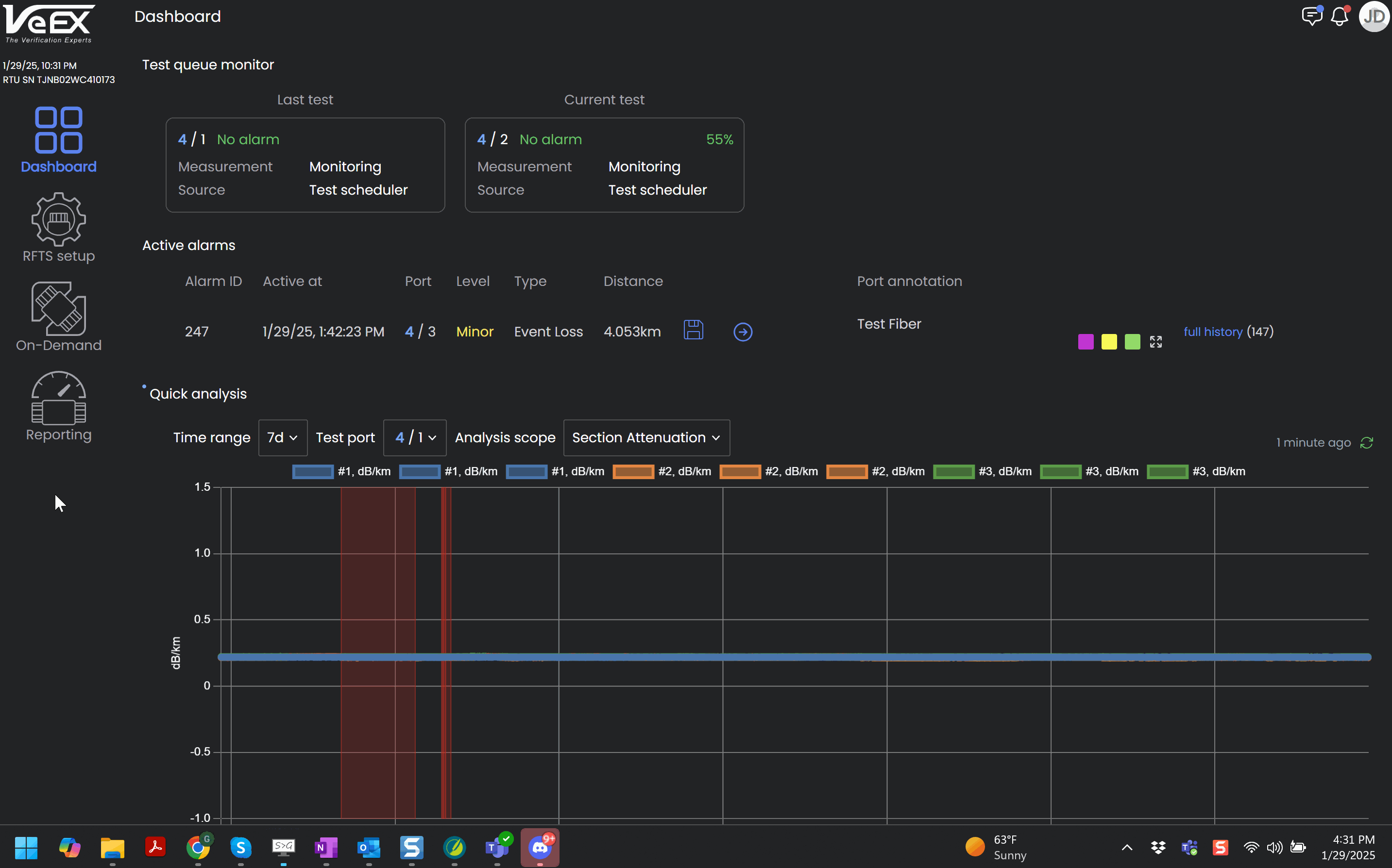 Type: Type of alarm triggered (loss, attenuation, reflectance, or fiber break).