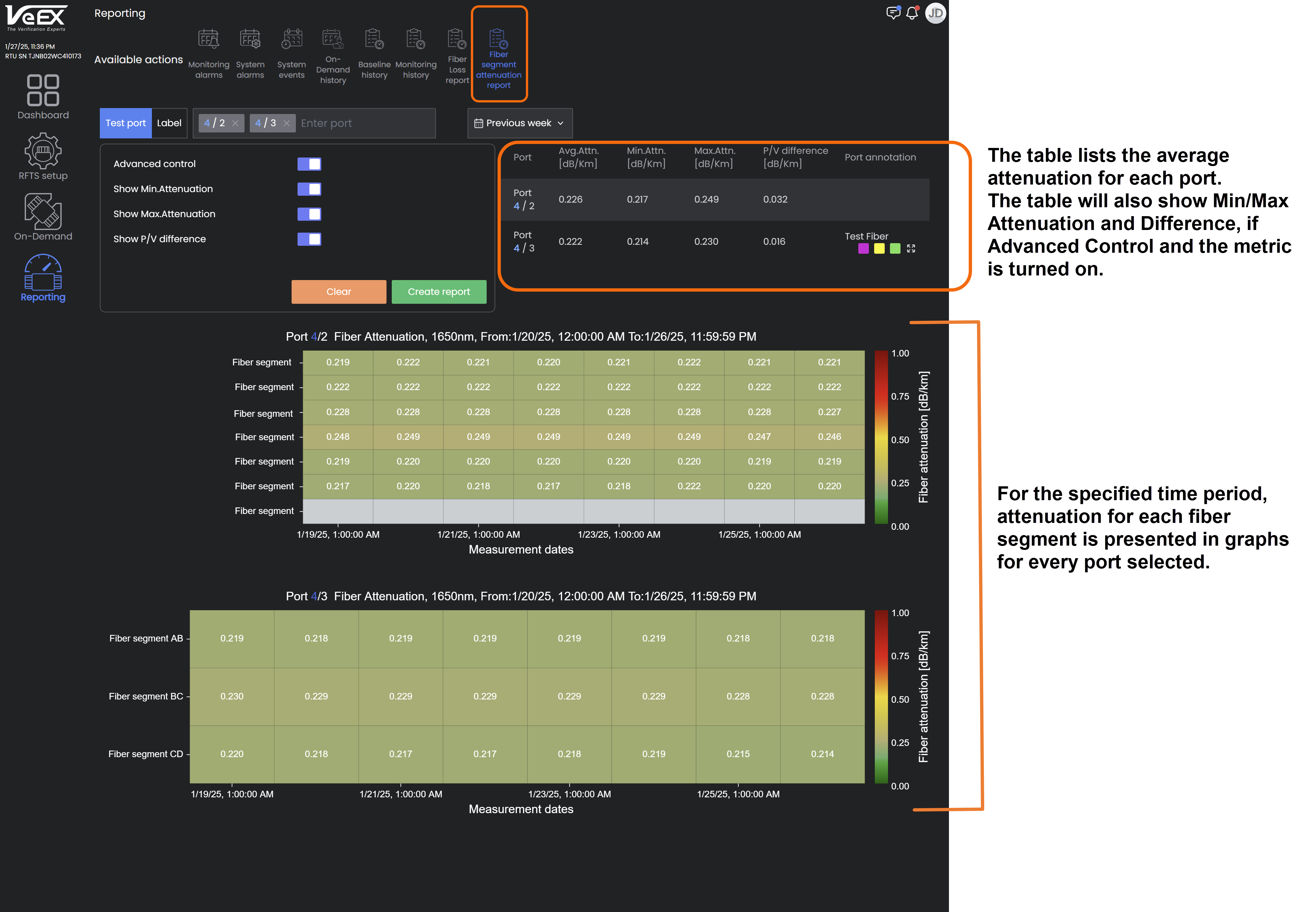 The Fiber Segment Attenuation Report shows measured attenuation for each fiber segment on a heat map.