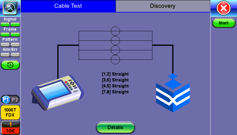 Press Start to begin the test. The test set will return the connection type (Straight or Cross Over) if connected to an end device. If fault is detected (Open or Short) the fault will be indicated as well as the distance to the fault.