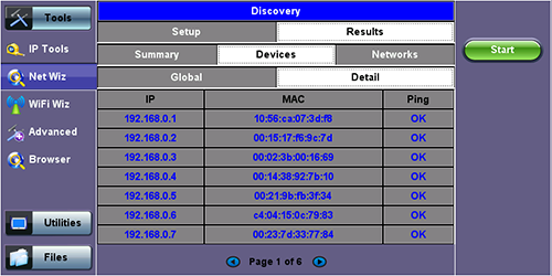 Detail displays the Attribute, MAC and IP Addresses, Group and Machine Names and Ping test results of each device discovered.