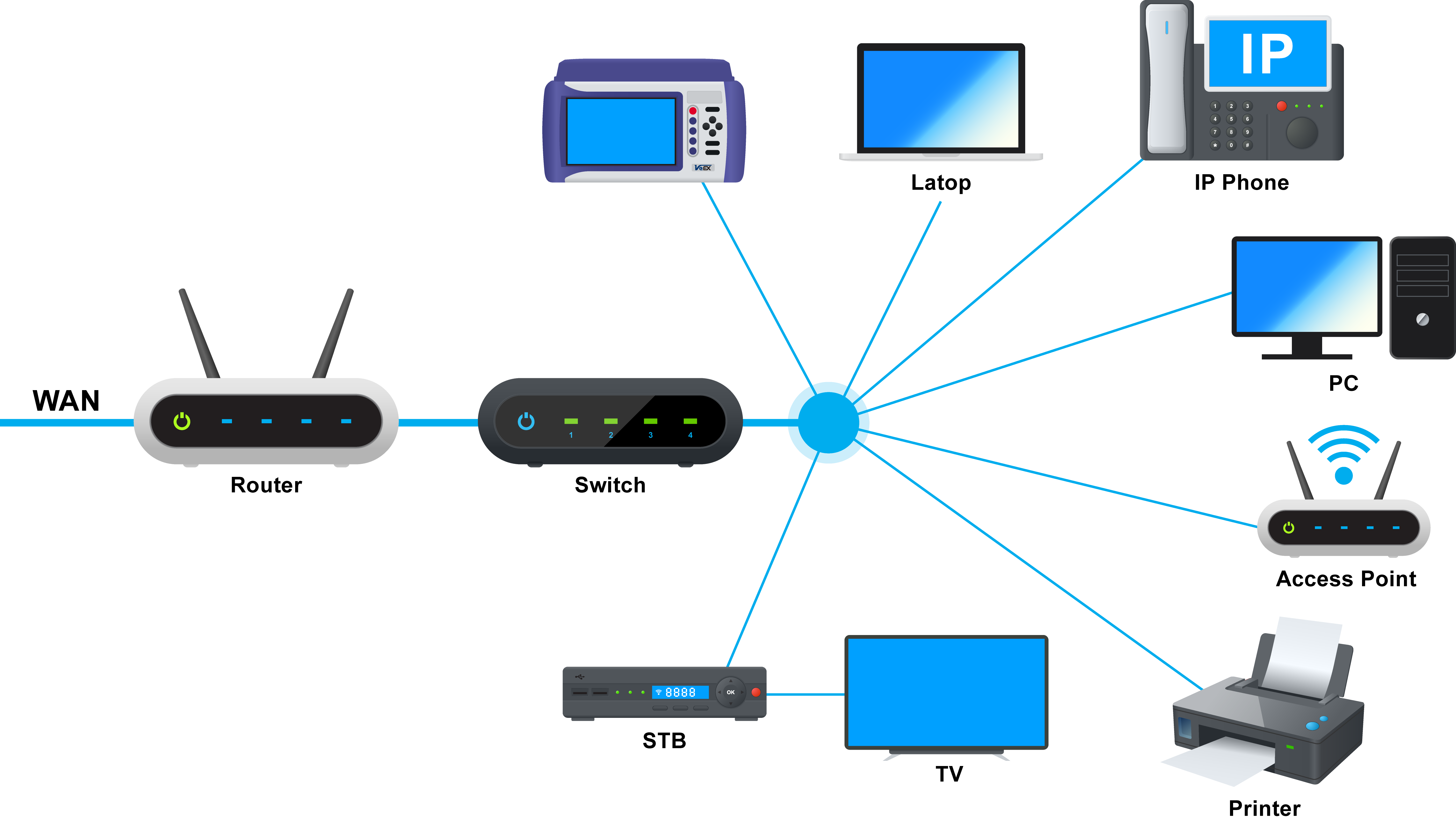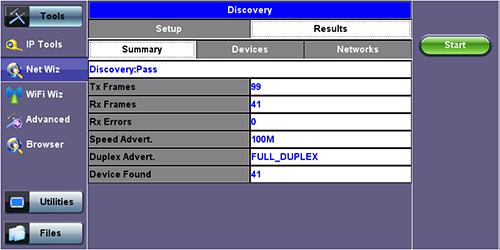 The Net Wiz function tests the Ethernet cable and associated network environment. A typical application is shown below.