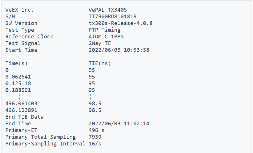 The resulting CSV file can be analyzed using VeEX's Wander Analysis PC Software or it can be exported or modified to be analyzed by more advanced third-party analysis tools. The data format is shown below.