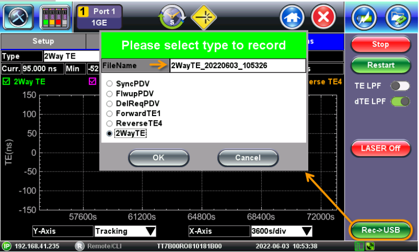 Pressing this button allow users to select one packet-based Time Error or timing parameter to record in an open CSV format for further analysis (e.g., 2Way TE).
