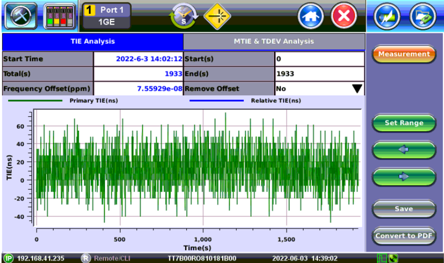 By default, this screen shows a complete view of all the TIE or TE data captured, so users can visually identify short-term, long-term stability issues, frequency offset (ramp) and other characteristics.
