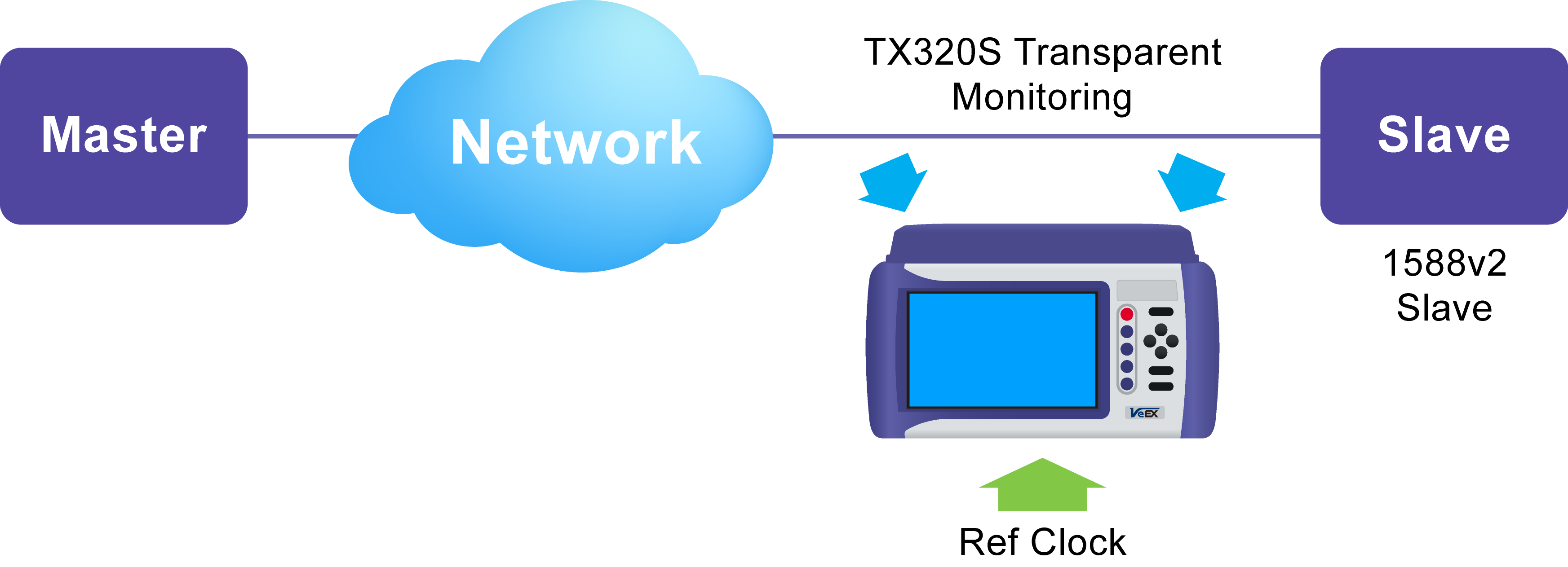 When placed in 1588v2/PTP Through Mode, the TX320S makes use of both ports to analyze network 1588v2/PTP traffic exchanged between Master and Slave. The unit can be inserted on the network path in passthrough mode between P1 and P2 or non-intrusively via a network tap.