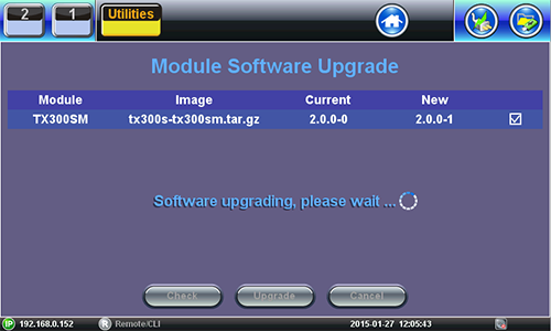 2. Select new version and press Upgrade. The test set turns itself OFF at the end.