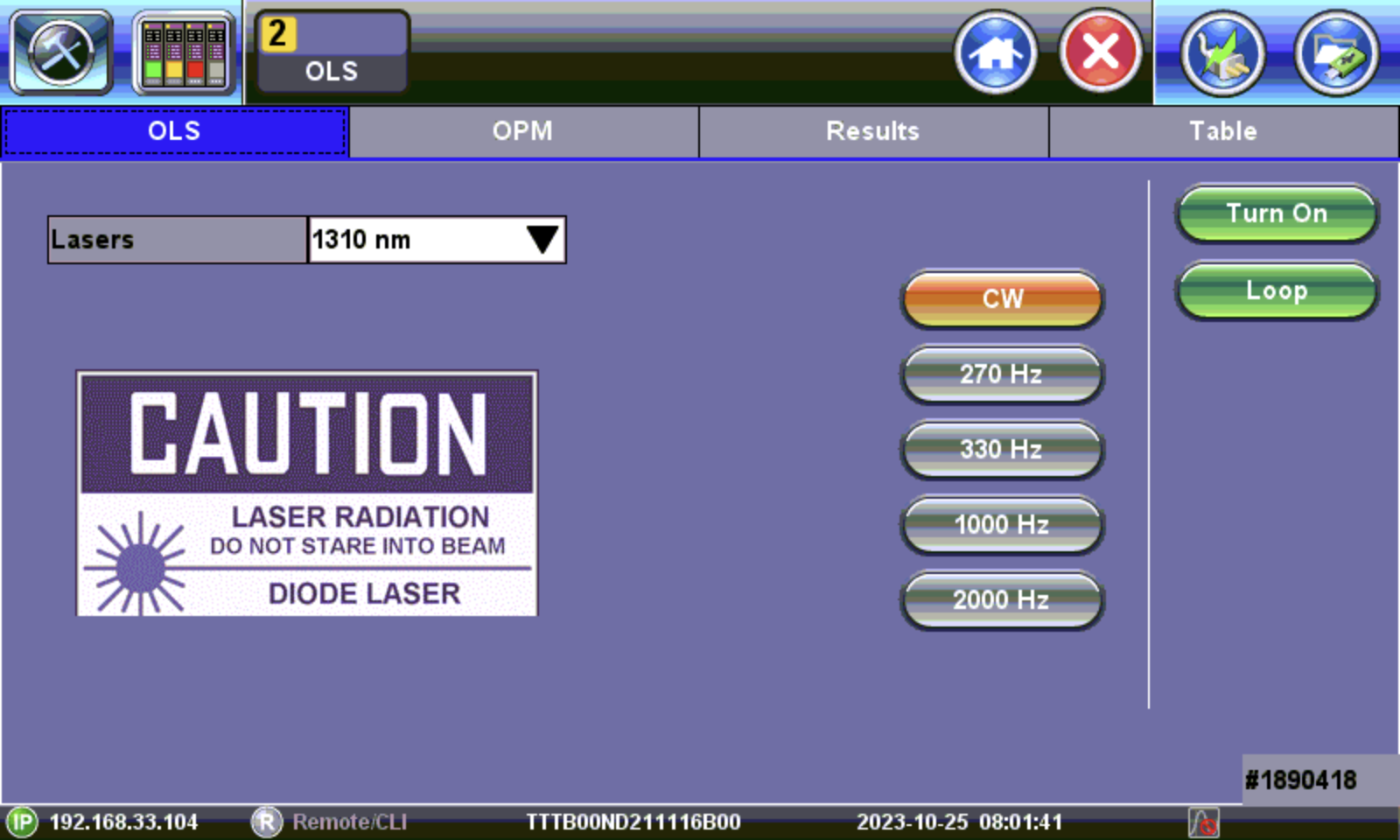 4. Select the OLS tab, select the laser wavelength, and turn ON. Press Loop to select and cycle through all desired wavelengths.