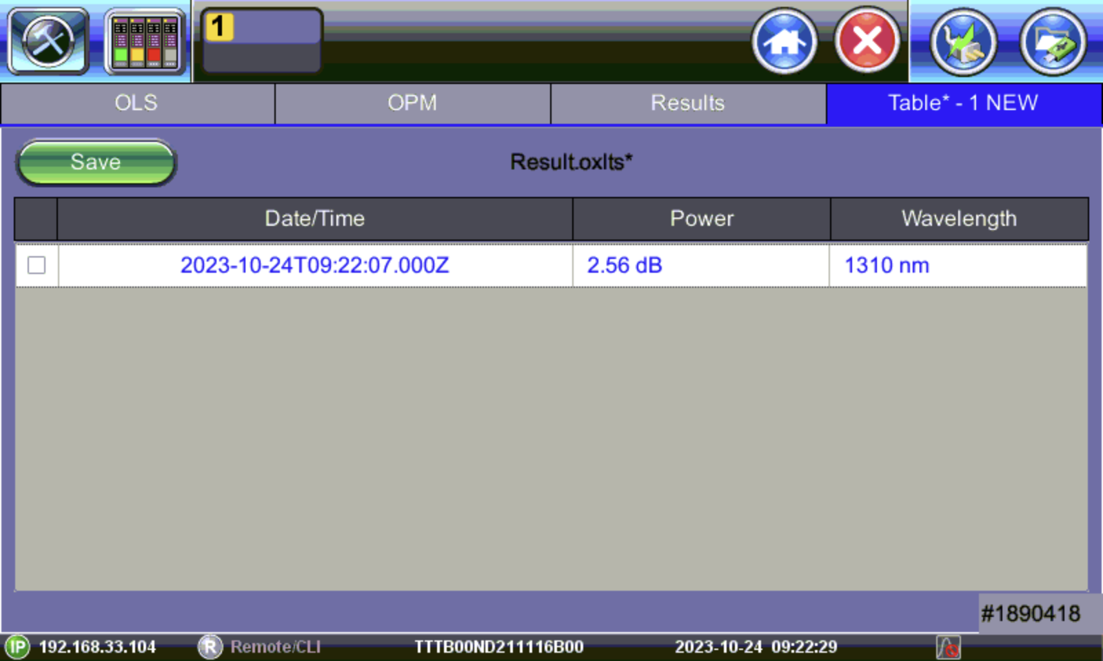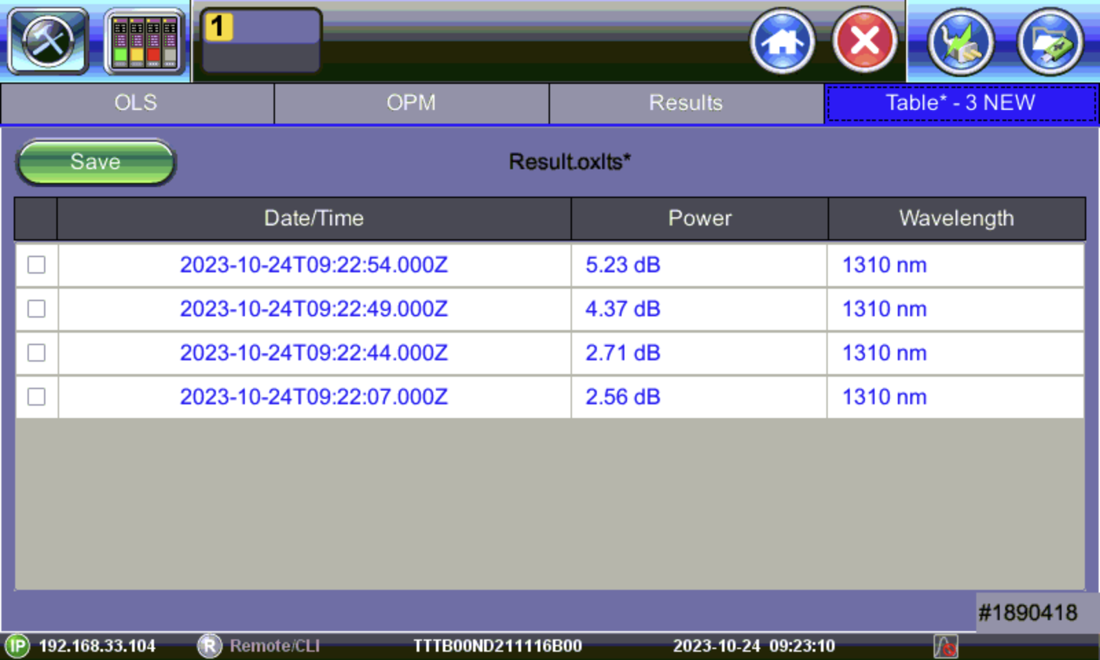 OPM readings appear in the Table tab. Saving readings will permanently write data to the Results tab. More than one reading can be saved at a time. Use this function to organize/filter results in project batches, so that the correct set of results are grouped together appropriately. Pressing Remove will permanently remove the readings from the current list.